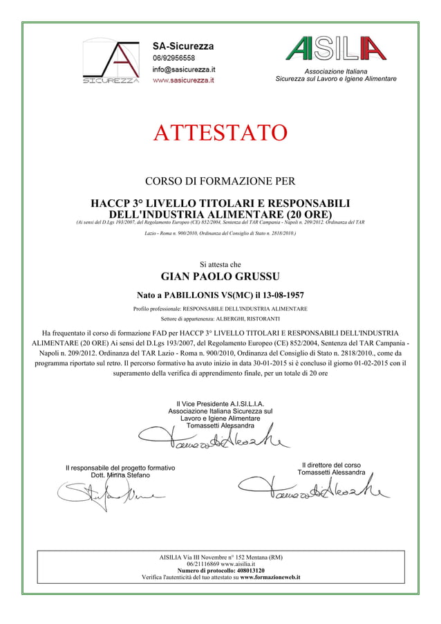 Il corso si rivolge a tutto il personale addetto alla preparazione, manipolazione e vendita di prodotti alimentari, i quali hanno l'obbligo di formarsi in materia di sicurezza e igiene alimentare. Quando si parla di prodotti alimentari l'attenzione è particolarmente alta poiché un cibo contaminato o non correttamente conservato può mettere in pericolo la salute del consumatore. Il corso osa è un requisito obbligatorio per tutti i titolari di un'impresa alimentare pubblica o privata con o senza fini di lucro (mense, ristoranti, catering, bar, attività alimentari, pizzerie, grande distribuzione) o per le figure delegate allo svolgimento del ruolo di responsabile della gestione delle procedure di autocontrollo (responsabili di produzione, capo reparti, ecc.). Per operatori del settore alimentare. Facendo seguito alle disposizioni del regolamento (ce) n. Il corso per alimentaristi, meglio conosciuto come corso haccp, è obbligatorio per tutti i lavoratori addetti alla produzione, preparazione, manipolazione e vendita di alimenti. Corso per il personale addetto al settore alimentare (ex libretti sanitari) a chi si rivolge: Il corso è strutturato secondo i principi cardine definiti dalla normativa attuale in materia di igiene alimentare, in primis il regolamento ce 852/2004, e propone un percorso formativo completo e versatile; È possibile frequentare online il corso, in modo del tutto gratuito, ricevere l' assistenza di un tutor ed effettuare il test di valutazione direttamente online. Cerchi corsi di formazione sul lavoro o per l'haccp? 11/2003 e della dgr n. Apprendere le pratiche di assistenza alimentare sicure necessarie per l'industria della ristorazione con questo corso gratuito di igiene del cibo online. Corso haccp lombardia per conoscere tutte le principali regole dell'igiene e della sicurezza alimentare, rivolto a tutti i professionisti che entrano in contatto con gli alimenti in qualsiasi fase del lavoro, a partire dalla produzione fino al trasporto.